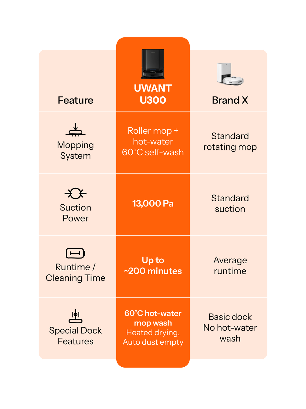 The U300 combines 13,000Pa suction with 60°C hot water to dissolve grease and inhale heavy debris in one devastating pass.